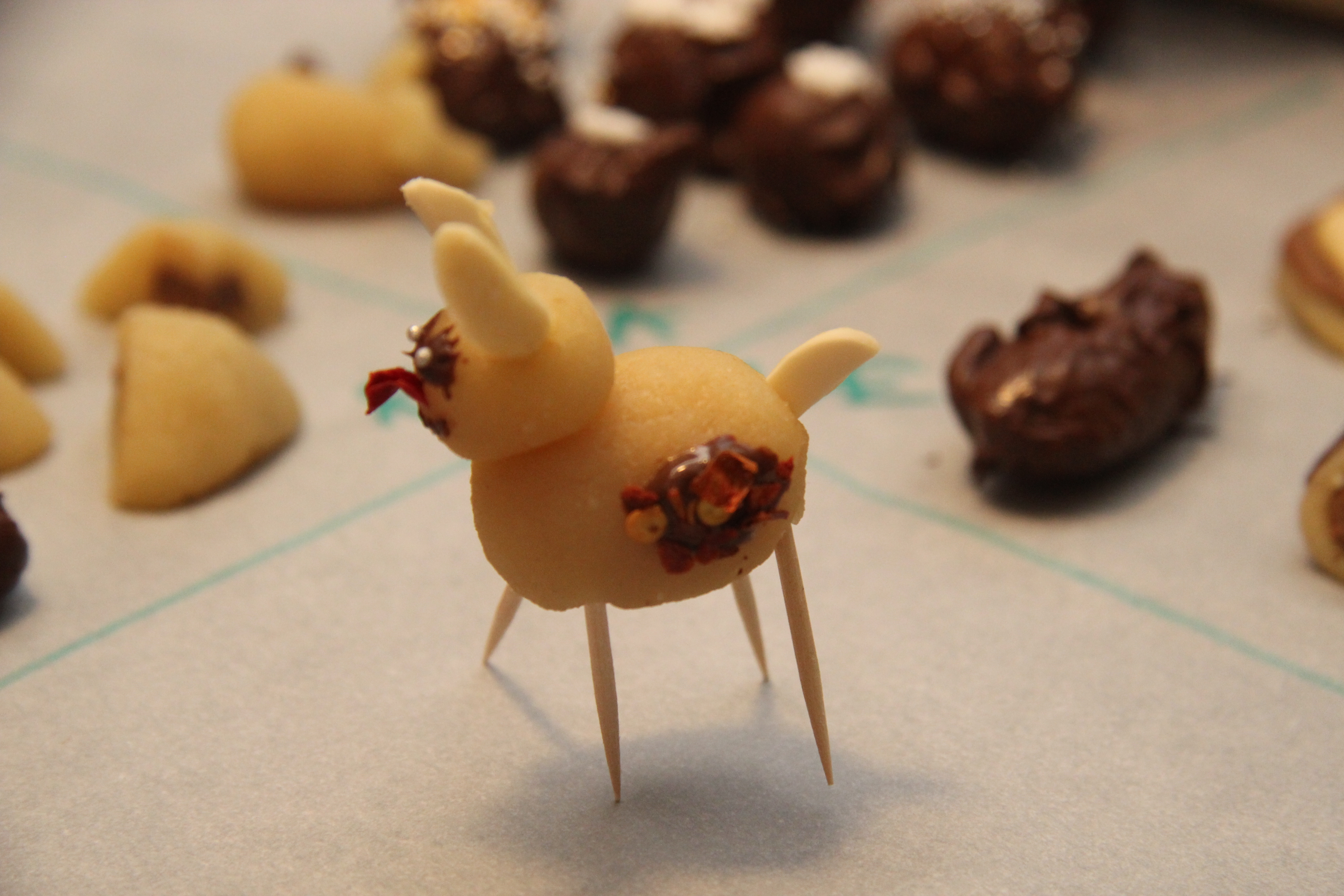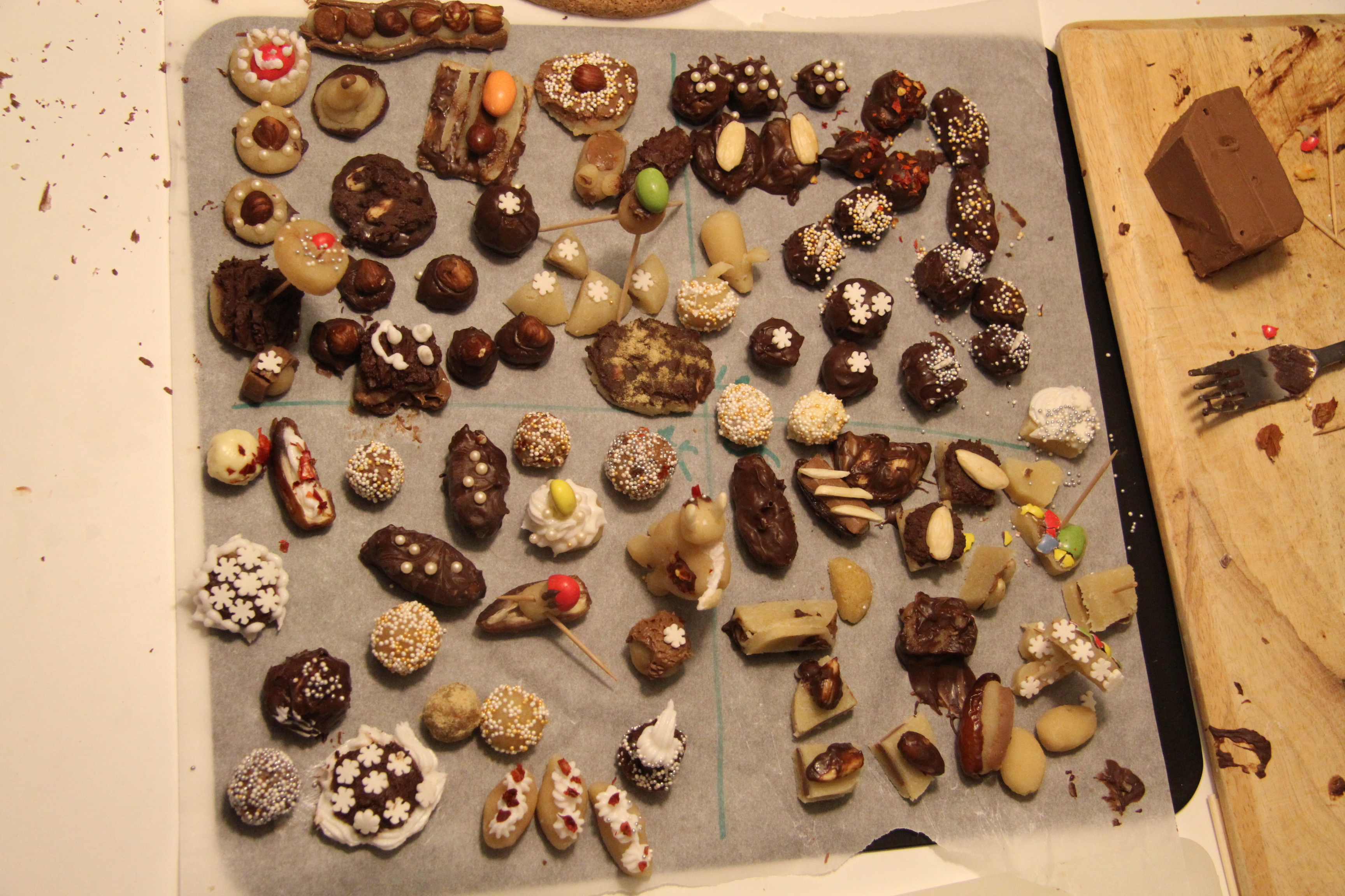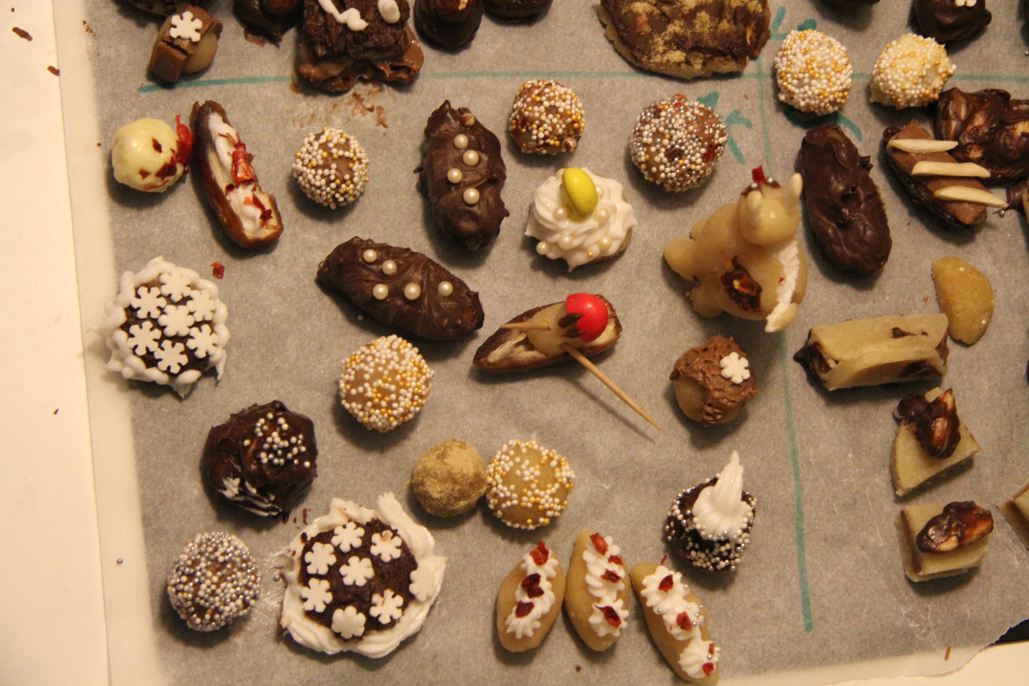 Derhjemme lavede vi som regel konfekt d. 22 december. Fire børn og to voksne, 2 ruller marcipan, to liter kogechokolade, en blok nougat og 3 dl. håndsved. Far der konsekvent laver hundelorte. Mor der masseproducerer ensartede stykker, som man rent faktisk orker at æde efterfølgende, og kontant instisterer på, at der skal chokolade rundt om det hele for “ellers bliver de tørre!”. Og så fire børn med hver deres lille firkant på et stykke bagepapir. Konfekt freestyle! Det smager af lort men who cares, så længe børnenes finmotorik får et los bagi. Så det gjorde den. Jeg elskede at imponere mine små søskende med mit naturlige finmotoriske forspring, så jeg excellerede som regel ud i kunsten at lave kunst. Mange små mus blev det til – ofte pakkede jeg dem ind i tændstiksæske med bånd omkring og så kunne min onkel Morten få dem til jul. Det samme gjorde i øvrigt mine søskende, så Morten kunne med lige dele skuffelse og kvalme pakke fire Tordenskjoldsæsker med assorteret marcipancrap ud juleaften – talk about hadegave. Sorry Morten – jeg lover det er sidste gang i år!