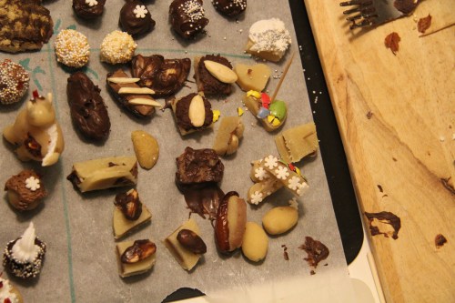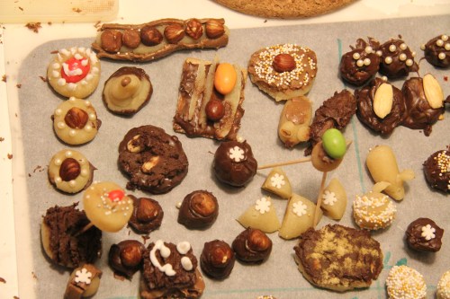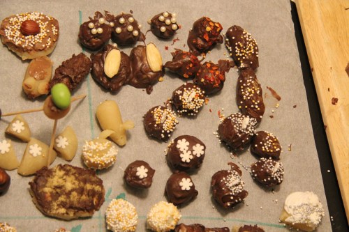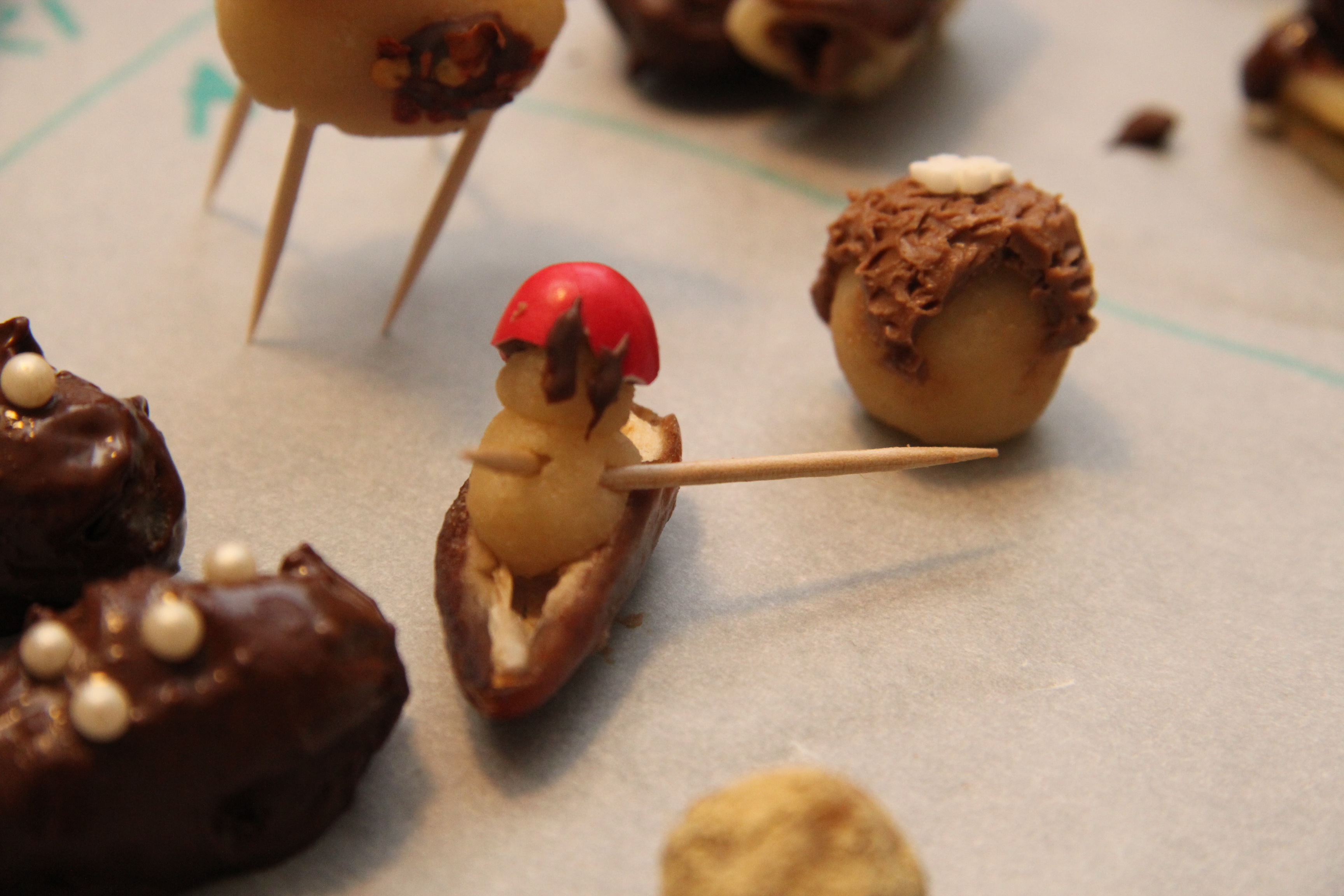 Så i weekenden lavede vi igen konfekt – denne gang kun børnene. Spændende nok at observere (sagde psykologen), hvordan vi hver især får nye roller i konfektmageriet, når nu ikke mor og far sidder for bordenden og forsøger at diktere udfoldelserne. Jeg har det fint med min position som det dygtige barn med den gode finmotorik, hvorfor jeg har beholdt foromtalte rolle. Yndige ting lavede jeg (ja, fuck off Jante!): En hjort med et kødsår, fine ufoer med snepynt, en mand i en kano osv. osv. Lærke prøvede naturligvis at gå mig i bedende, men selvom hun i modsætning til mig har et år på arkitektskolen i bagagen, mener jeg ikke det lykkedes hende at opnå samme høje konfektniveau som undertegnede. Laura hoppede hurtigt ind i mors rolle og masseproducerede konfekt med chokolade på. Sandt at sige, var det da også det, der først blev spist – men kunst – nej det er det ikke. Rasmus fulgte sit gamle mønster med store, meget bastante stykker – han har altid været en dreng med en hang til kvantitet. Desuden lavede han også en fin lille marcipanlort – som far så søn.