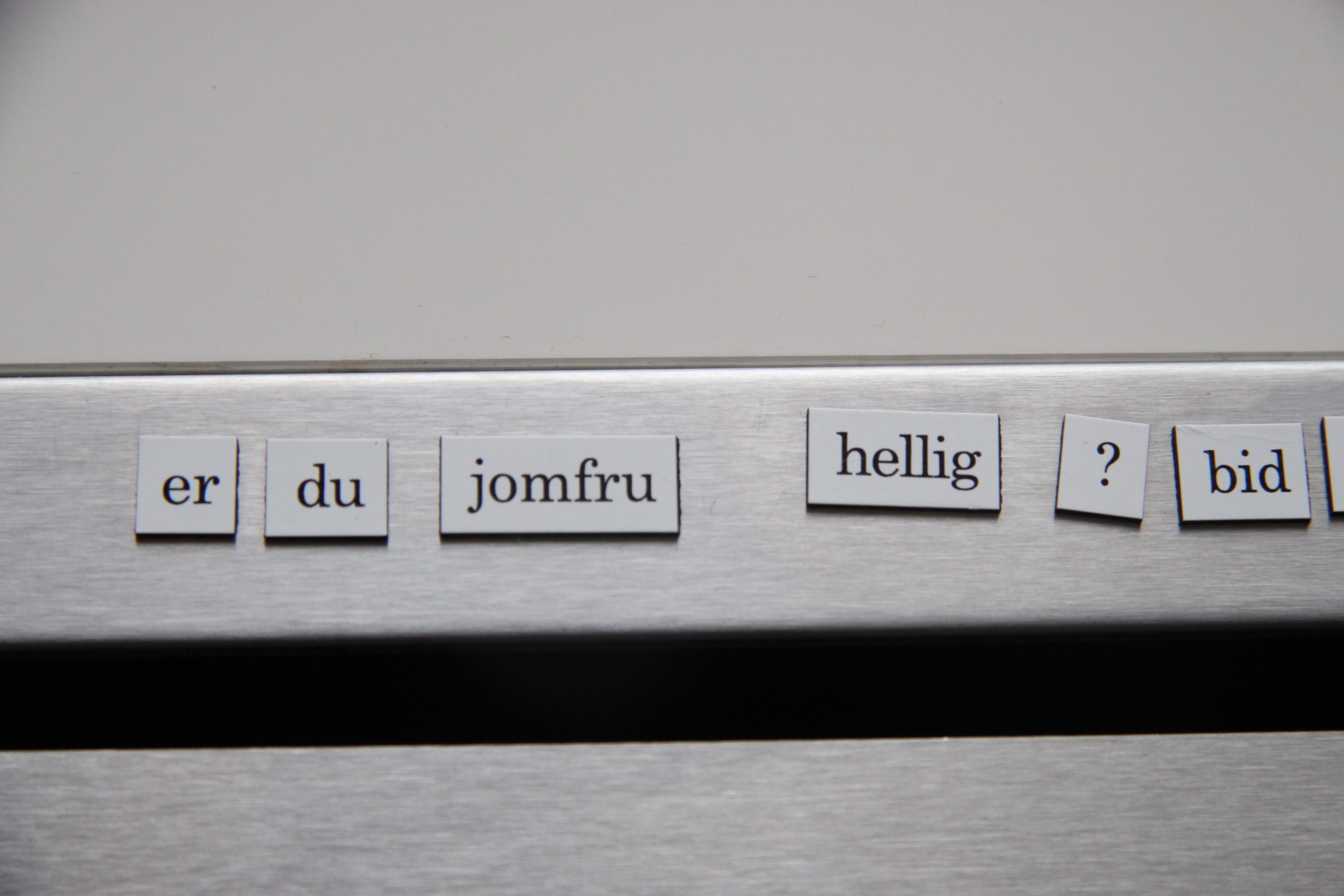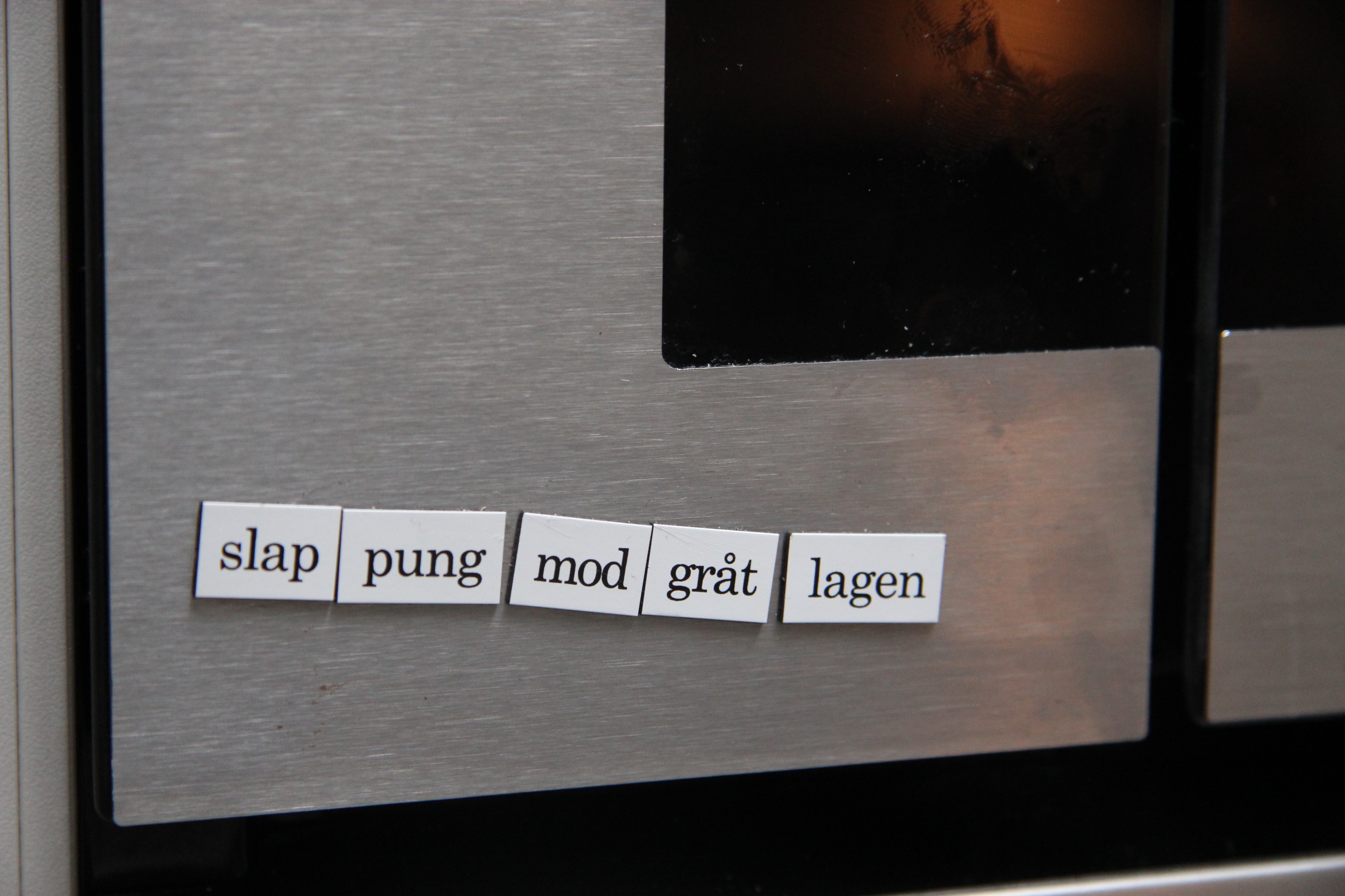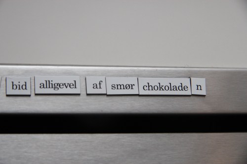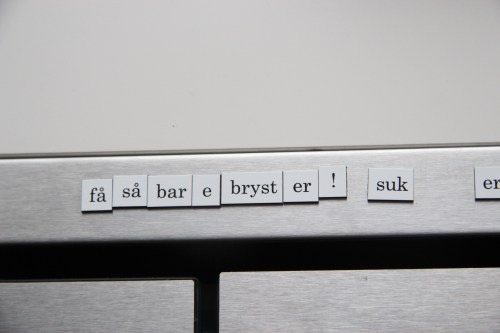 Vi har det brandvarmeste køleskab i blokken…eller rækken hedder det vel…De sidste par år har et par hundrede mere eller mindre beskidte ord med magnet på bagsiden udgjort udsmykningen herpå og de har gjort det muligt for mangt en køleskabspoet med en lummer slagsside, at udfolde sig. Mens ægget koger, mens vandet køler af, mens kæresten afrimer fryseren, mens fadet står i blød, mens computeren genstartes eller en rendering er igang – mens livet går sin gang, lånes der et ord eller to og smuk poesi opstår. Her er et udsnit af den nuværende ordkunst – gid der vil komme meget mere.